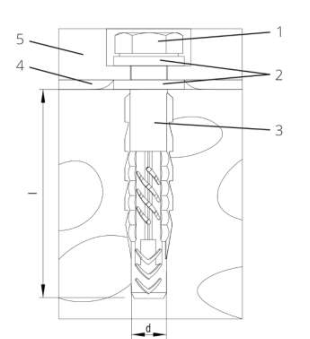 1) Sekskantskrue (d = 6 mm, l ≥ 30 mm), 2) Skive, 3) Dyvel, 4) Skumgummimåtte, 5) Ladestationens bundplade