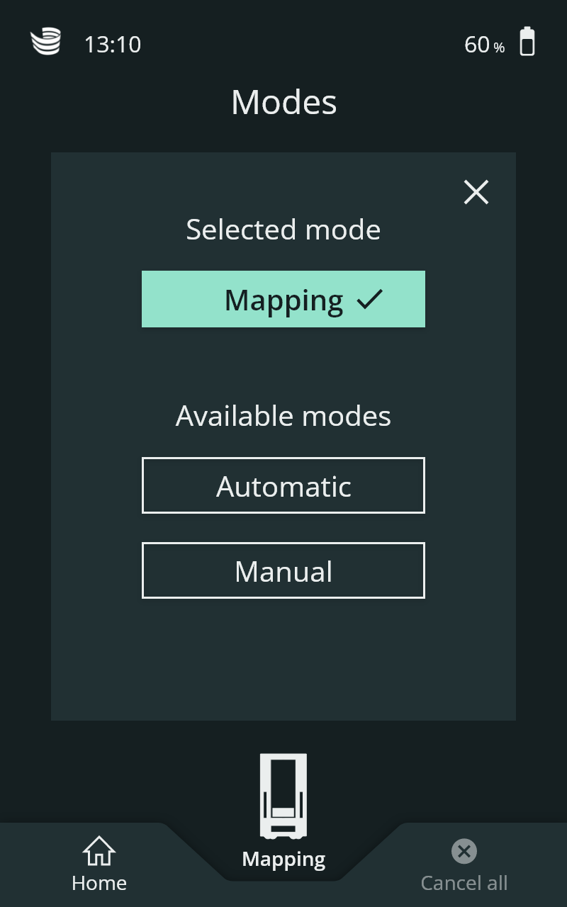The display can also be used to switch the robot to manual mode and from manual mode back to automatic mode.