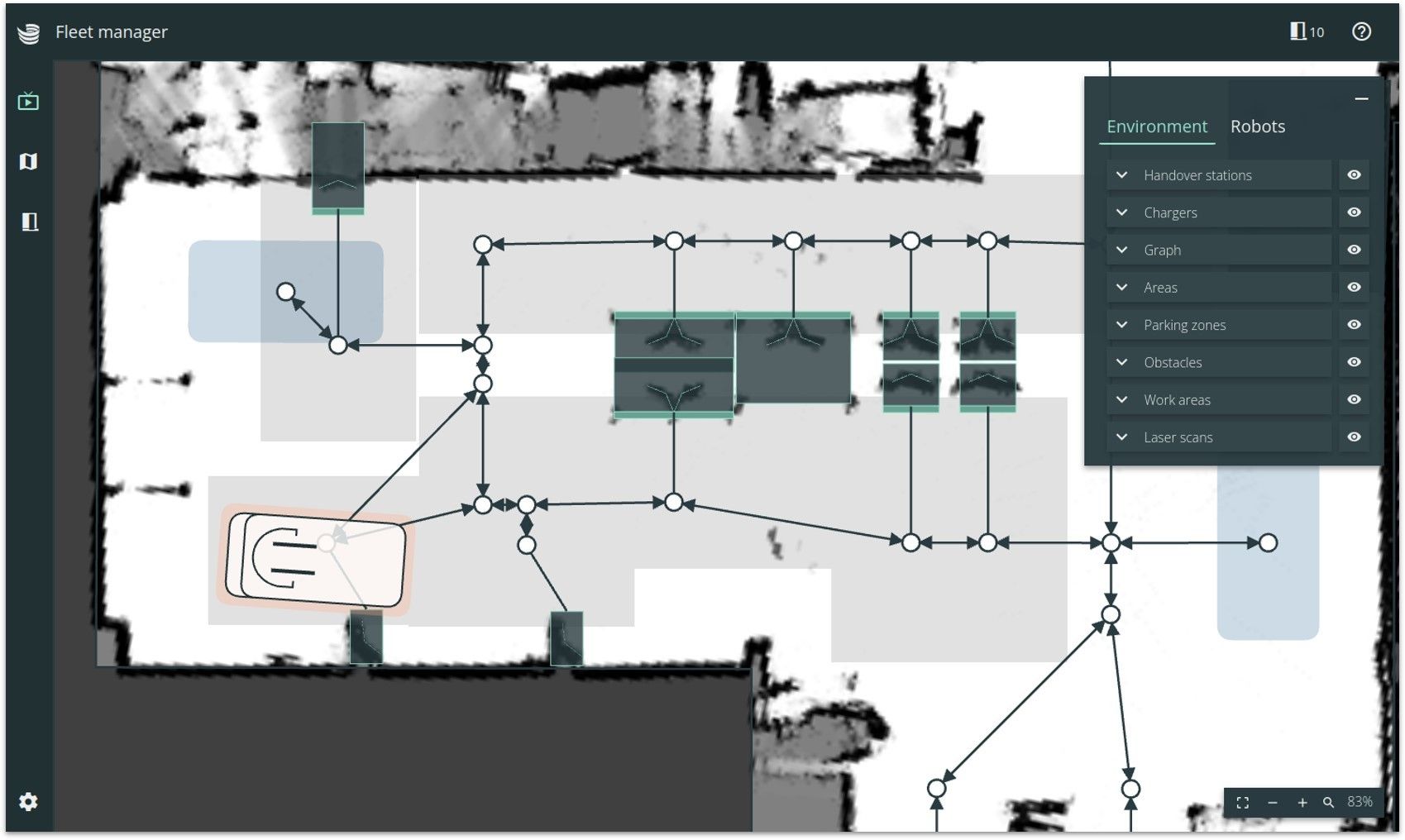 Mit dem Environment Editor können Sie Roboter-Arbeitsbereiche entwerfen und modifizieren, indem Sie potenzielle Routen, Übergabestationen, Ladestationen und vieles mehr festlegen. Sie können den Arbeitsbereich leicht an sich ändernde Produktionsbedingungen anpassen.