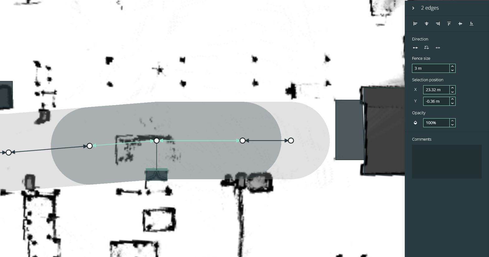Wenn zwei Übergabestationen benachbart sind, verbinden Sie sie direkt mit einer Kante. Die Verwendung eines schmalen Zauns an dieser Kante hilft dem Roboter bei der Planung.