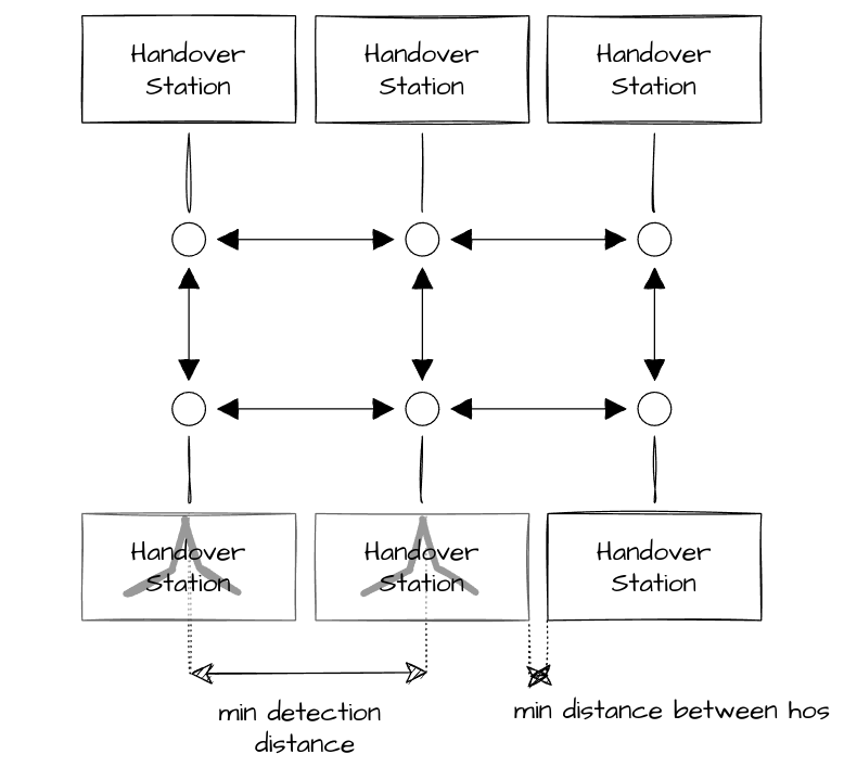 Mehrere Übergabestationen können auf engem Raum platziert sein, so dass ein Übergabebereich mit hoher Dichte entsteht. In diesen Fällen ist es möglich, die Knoten der Übergabestationen direkt über eine Kante miteinander zu verbinden. Dies verhindert, dass der Roboter auf zusätzlichen Knoten navigieren und drehen muss, was die Leistung des Roboters verringern kann.