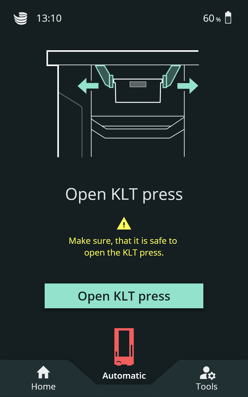 Das SOTO-Display bietet jetzt eine Funktion zum Öffnen der KLT-Klemme im Bereich „Tools“. Die Funktion ermöglicht die Behebung von Fehlern, bei denen ein KLT in der KLT-Klemme stecken geblieben ist.