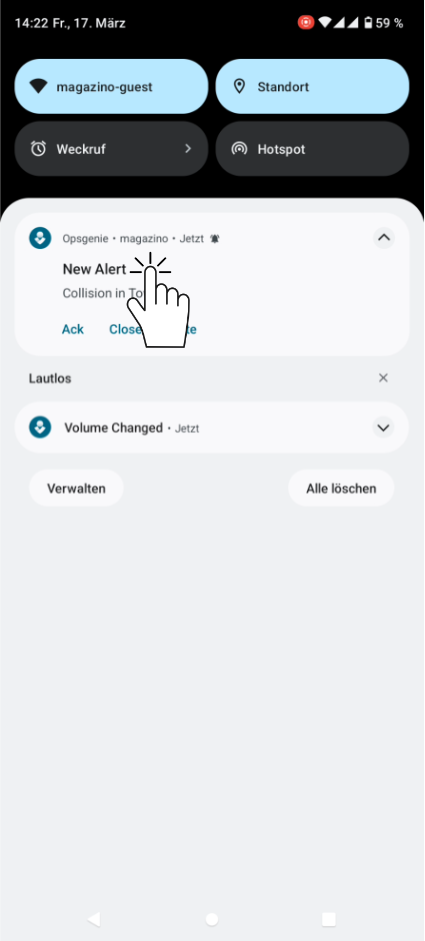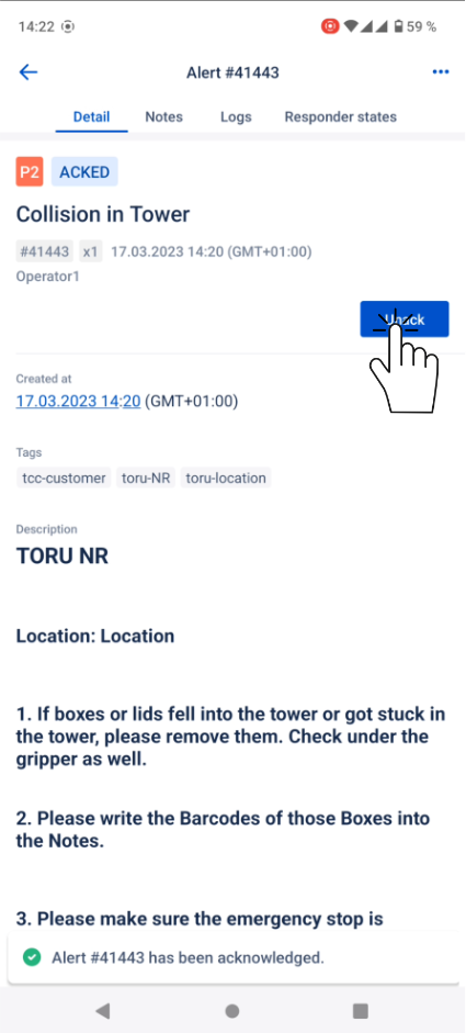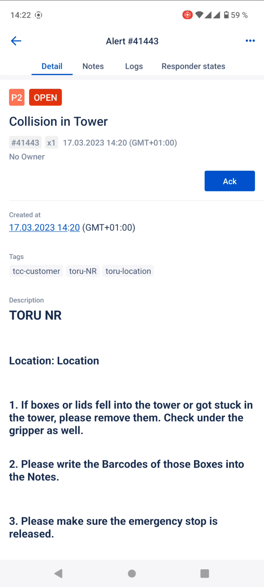 Sie werden eine weitere Benachrichtigung erhalten, wenn weitere Aktionen erforderlich sind. Wenn keine weiteren Maßnahmen erforderlich sind, wird der Roboter seine Arbeit zeitnah wieder aufnehmen. | ![]() Ein Remote-Operator kann den Status von "Ack" auf "Unack" ändern, wenn weitere Aktionen erforderlich sind.