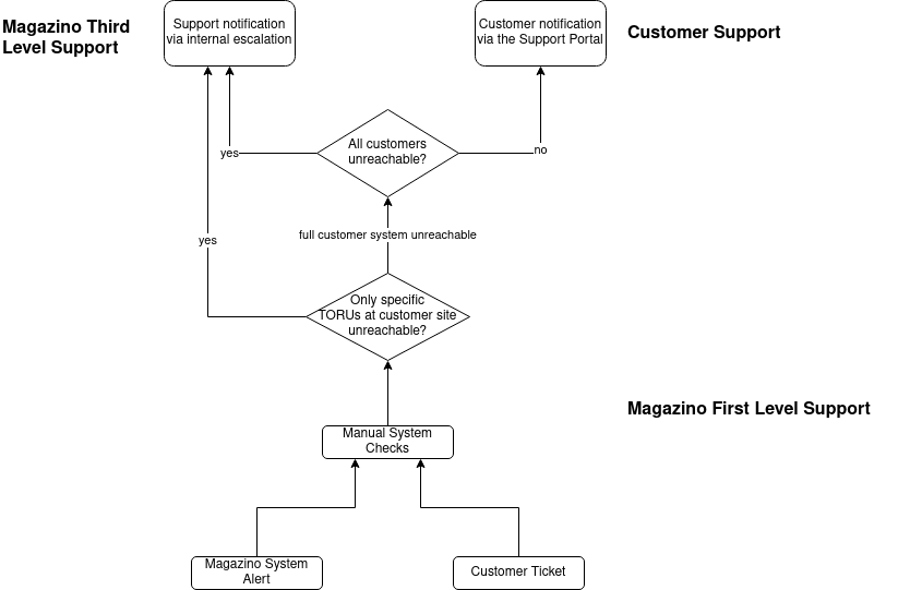 Sollten wir die Möglichkeit verlieren, uns mit allen Magazino-Kunden aus der Ferne zu verbinden, wird das Problem an unseren TLS weitergeleitet, da dies wahrscheinlich auf ein Problem mit der Magazino-Infrastruktur hinweist.