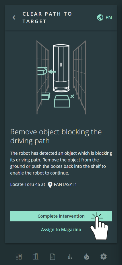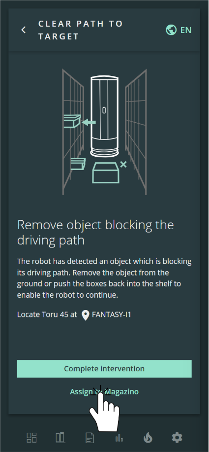 Alternatively, you can also select the intervention in the ARC sidebar or by selecting the blocked (red) robot on the map. | |