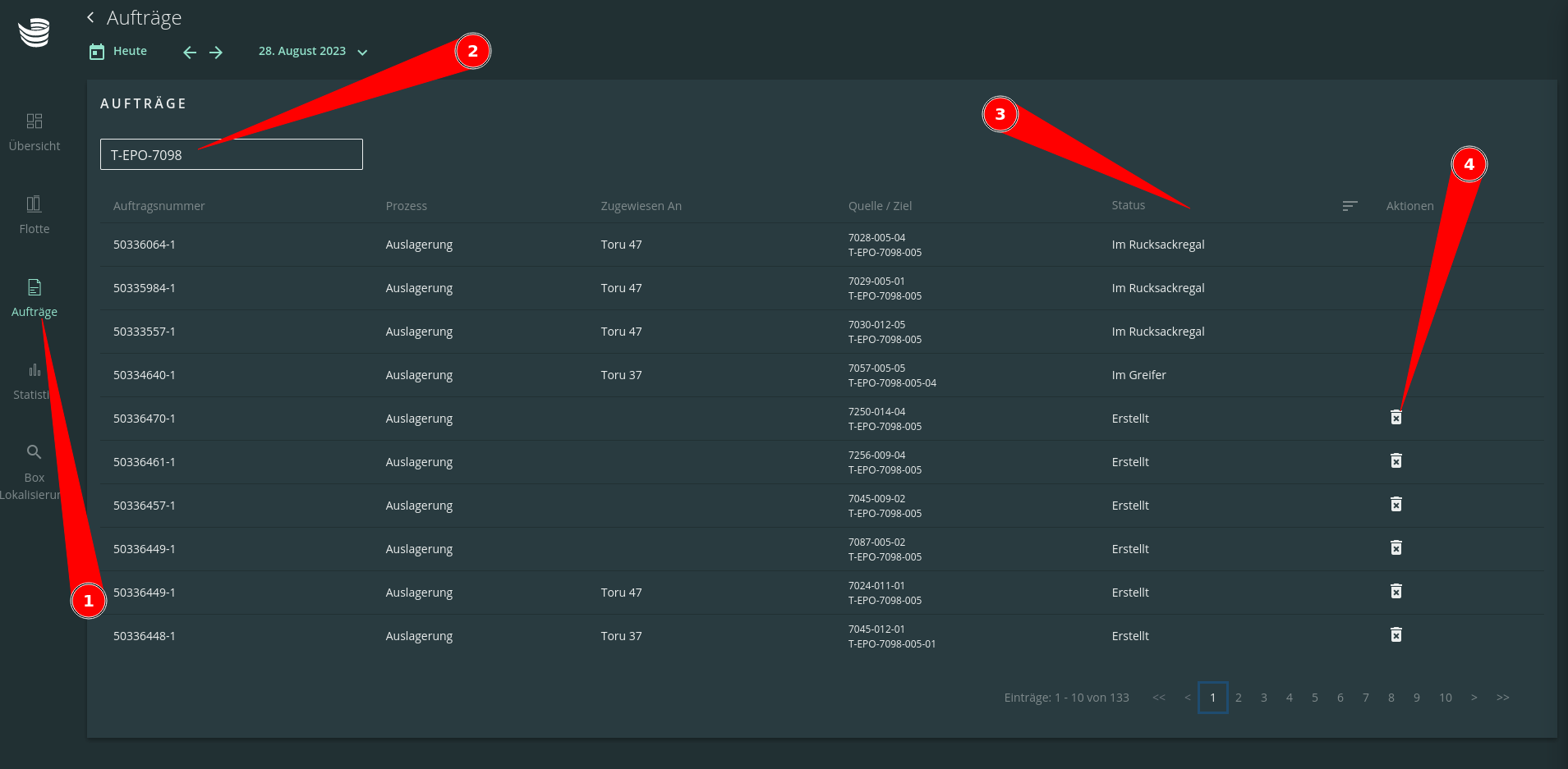 Enter the source or sink of the order you are looking for in the text field at the top left (e.g. the number of the pick cart)
