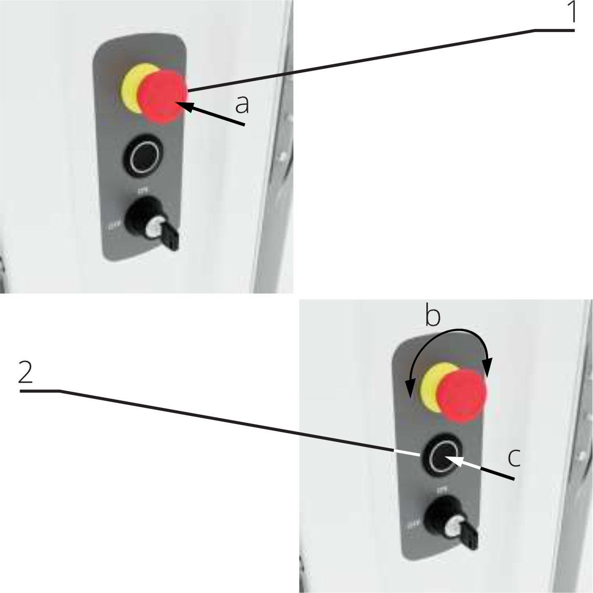| Warning! Danger of accident! When operating with damaged emergency stop buttons, dangerous machine movements may not be stopped in time.