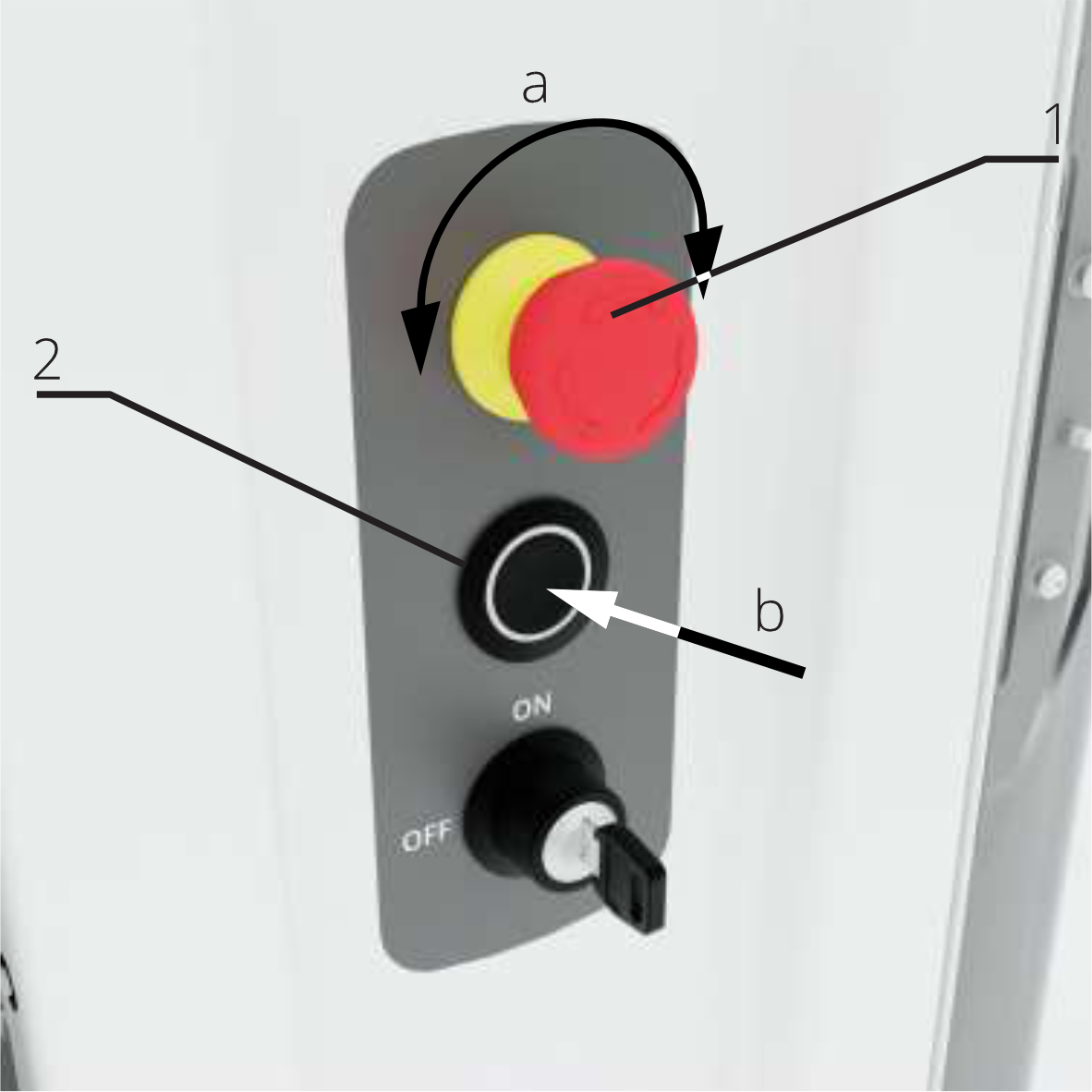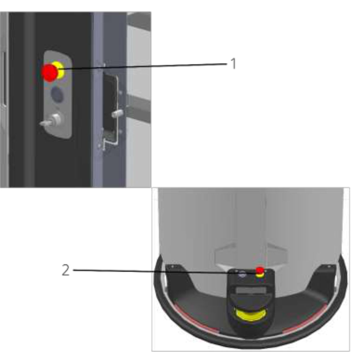 1) Emergency stop button at rear, 2) Emergency stop button at front